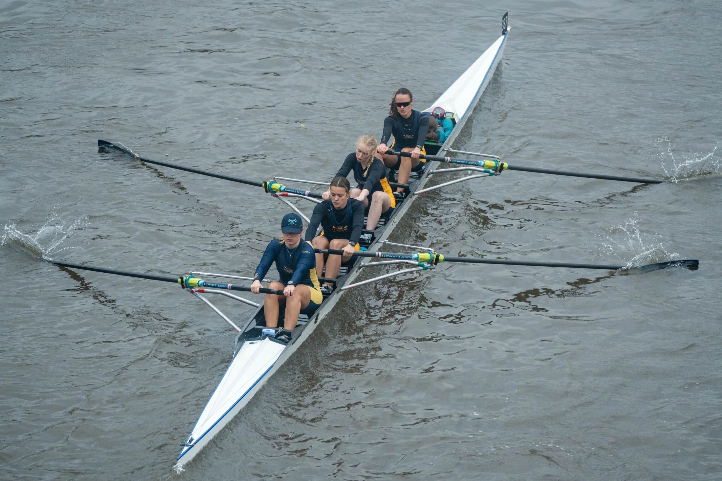 Andy Bridger describes their senior men’s experience: The tideway, 6.8km, four oars and a cox. Fours head posed a magnitude of challenge that dwarfed the previous competitions this term, both in terms of distance and calibre of competitor. Gone were the luxurious calm waters of the Isis and the flotilla of college crews that make it their home and, in their place, stood the expansive tideway and an armada of university crews. To face the challenge: Andy Bridger, Theo Fawcett, Bernd Sturdza and Peter Manshausen (with super-sub Emily Insanally coxing, keen to make amends after winning the 2020 Women’s Lightweight Boat Race in the wrong colour blue). After an extensive period of marshalling, and the loss of their bow number at the spiteful hand of Imperial, Univ Men’s A was ready to race. Starting between an OUL boat and an Imperial crew, Univ were aiming to make a statement. The first half of the race saw Univ pull away from the chasing Imperial crew but hold the distance with OUL. Despite some strong pushes in the back half and an ambitious final wind, Univ were unable to close the gap and crossed the line in 21:05, 6th of 10 in a very close Op Ac4+ category, with 3rd place claimed in 20:56. Ultimately, the experience was a promising outlook for the rest of the season for a crew aiming to be competitive above the college level.